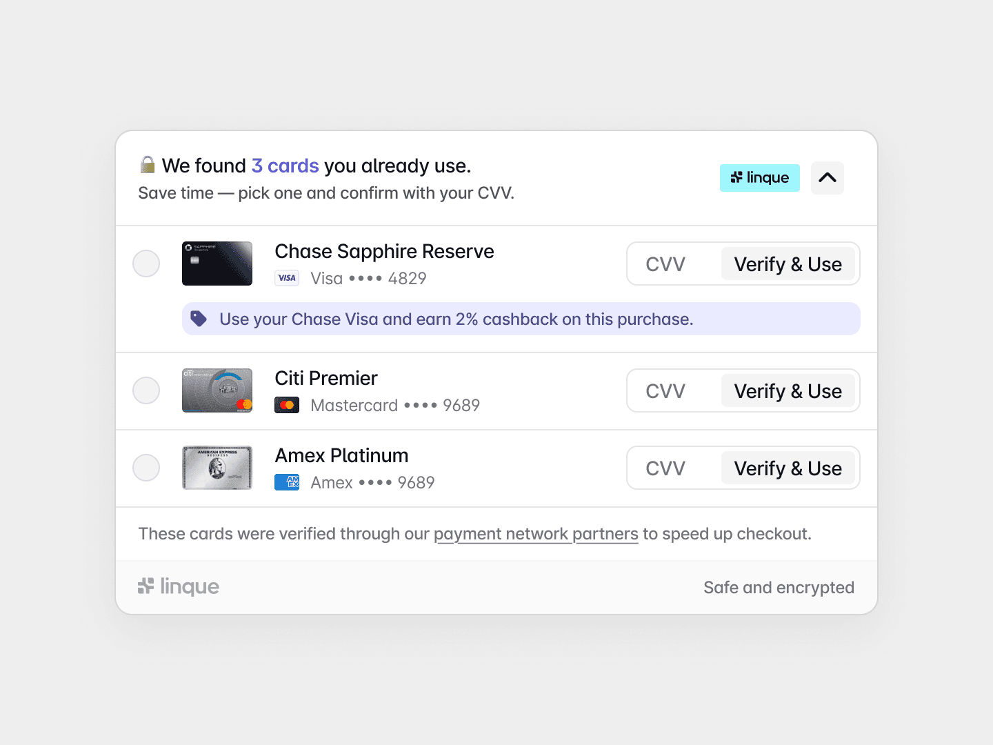 Instantly load and authorize customers’ existing payment methods. No passwords and no manual card or bank account entry. See checkout success skyrocket.